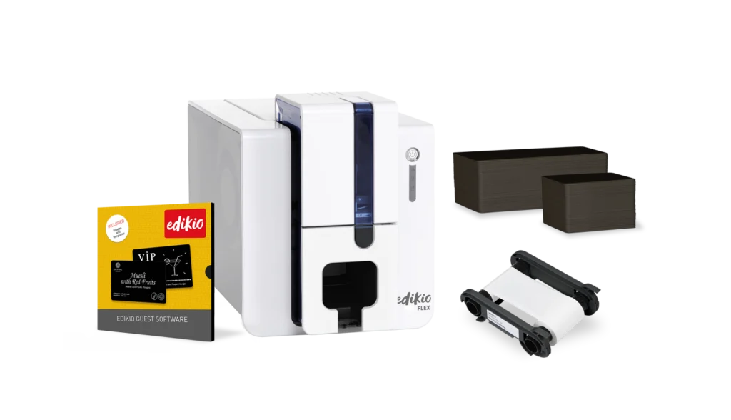 With Edikio Guest, Edikio GuestWith our comprehensive range of accessories and consumables, you can fully express your company’s identity. Cards, printing ribbons, holders, each element adapts to your style and values. Elegant metal brackets for mounting or clipping on, print ribbons available in several colors, alternative print media to PVC – we’ve thought of everything to enhance your establishment.