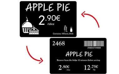 Eating habits (kosher, halal, vegan, etc.) Dietary restrictions (gluten-free, milk-free, sugar-free, etc.) Specific labelling (local, organic, home-made, etc.) Display multiple prices on the same label: Unit price and price per kilo, per liter, etc. Promotional sales price
