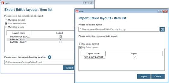 You can export item lists or label templates created in Edikio software for use on other computers also equipped with Edikio. Save your entire Edikio session. Allows you to export item lists and/or templates in “.zip” format, then import them on other computers. Ideal for retailers, who can create label templates and categories once for all their outlets.