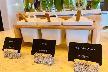 The Portman Ritz-Carlton uses custom labels to present dishes at its Portman restaurant and Executive Lounge, both of which offer buffets. The labels feature custom-designed and printed cards to indicate the prices of meals and items sold at the Ritz Bar & Lounge, tea rooms, and gift shops.